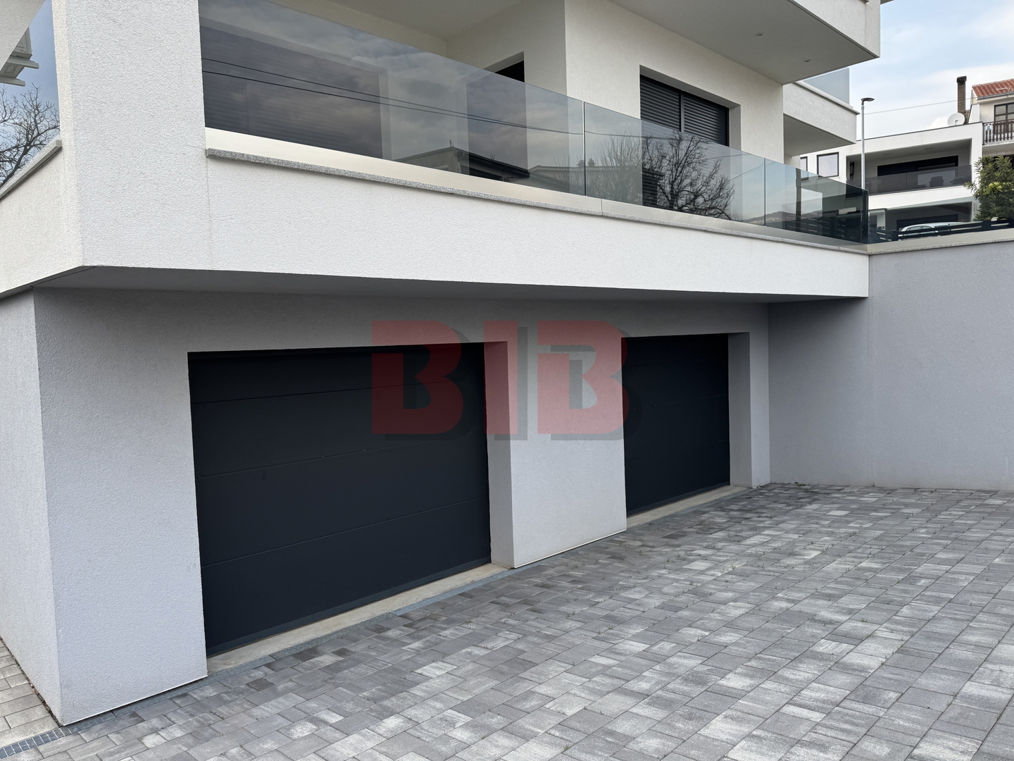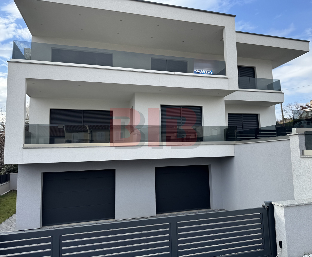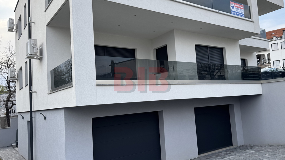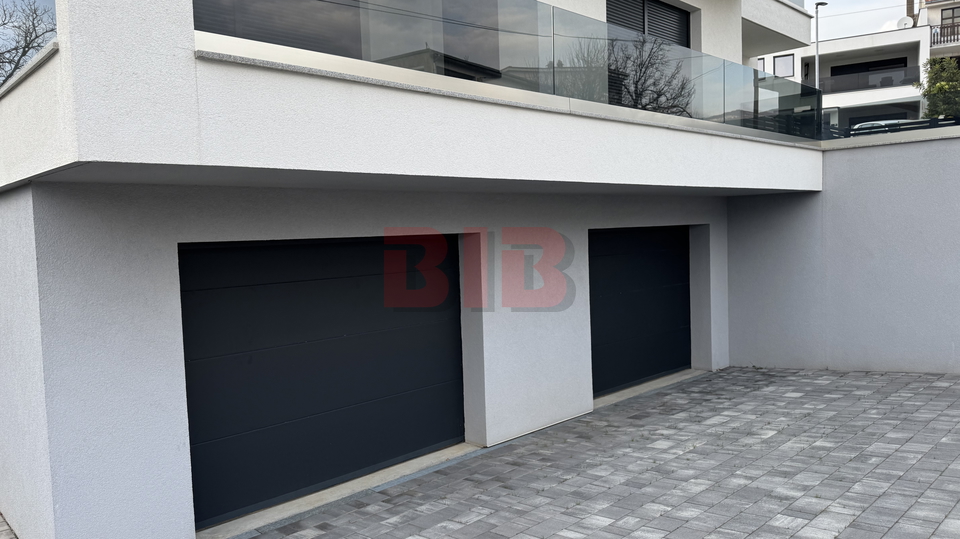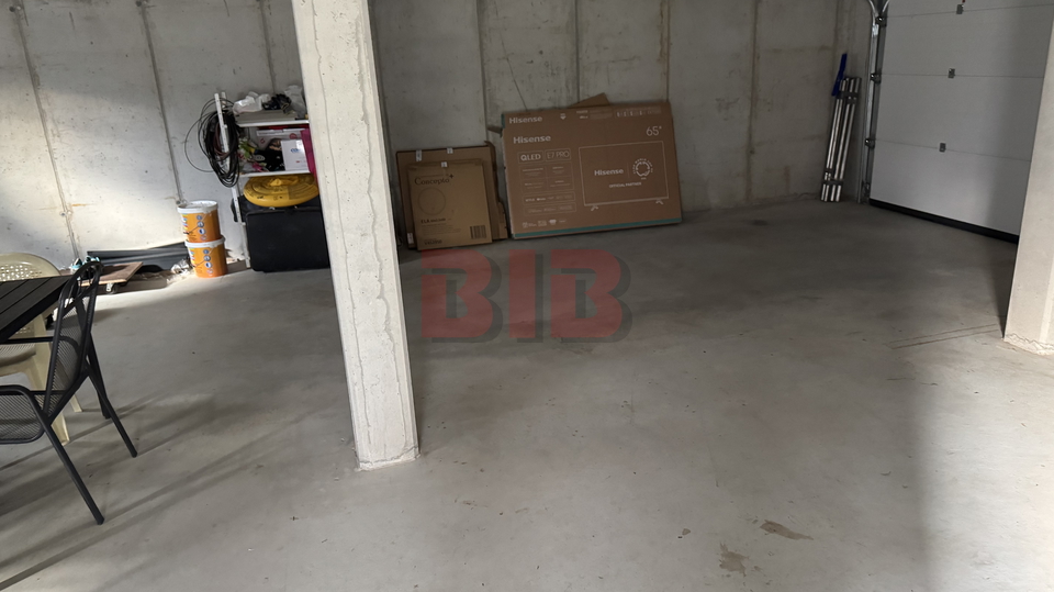 U prizemlju se nalazi dupla garaža,a na svakom katu je veći stan,dvosobni sa dnevnim boravkom,dvije kupaonice i terasom.